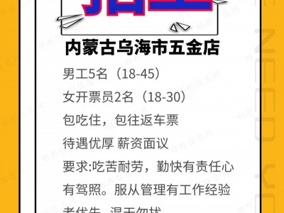 内蒙古乌海市五金店招男工5名,(18-45)女开票员2名(18-30)包吃住,包往返车票,待遇优厚, 薪资面议.要求:吃苦耐劳,勤快有责任心,有驾照。服从管理有工作经验者优先 混天勿扰 ,电话: