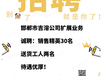 邯郸市吉溶公司扩展业务,诚聘销售精英30名,待遇优厚!有意者联系。送货工人两名