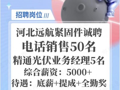 河北远航紧固件诚聘:电话销售50名,精通光伏业务经理5名,综合薪资:5000+ 待遇:底薪+提成+全勤奖+奖金+公休+团建 月入过万不是梦