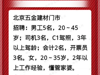招聘:男工5名,20~45岁;司机3名,C1驾照,3年以上驾龄;会计2名,开票员3名。女,20~35岁,2年以上工作经验,懂管家婆。