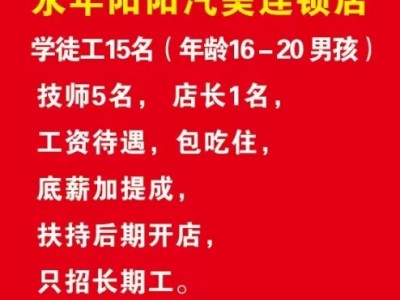 ▊▊▊招聘▊▊▊ 永年阳阳汽美连锁店 学徒15名16-20岁男孩。技师5名。店长1名包吃住底薪➕提成后期扶持来店只要长期工 地址火炬街与振兴路交叉口西行300米路北阳阳汽美 电话