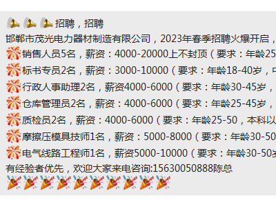 邯郸市茂光电力器材制造有限公司招聘:销售人员/标书专员/行政人事助理/仓库管理员/质检员/摩擦压模具技师/电气线路工程师,欢迎大家来电咨询:15630050888陈总