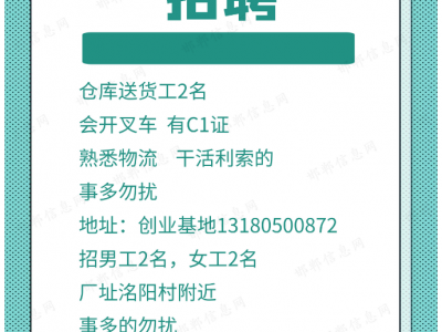 招仓库送货工2名,会开叉车 有C1证 熟悉物流 干活利索的 事多勿扰,地址:创业基地13180500872