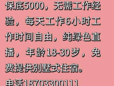 招美女主播,保底5000,无需工作经验,每天工作6小时工作时间自由,纯绿色直播,年龄18-30岁,免费提供别墅式住宿。