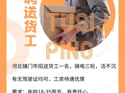 河北铺门市招送货工一名(18-35周岁)骑电三轮,长期能干者,有意者联系13047776611,15176003060刘营附近打电话,离刘营远的不要打电话,只限打电话。不要加微信……
