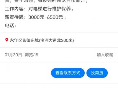 邯郸市悍马电梯工程有限公司诚聘:电梯维保人员2名(招学徒)。要求:年龄18-40岁,初中以上学历,做事认真负责,善于沟通,有较强的团队合作能力。 工作内容:对电梯进行维护保养。 薪资待遇:3000元-6500元。 电话: