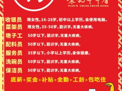 袁记串串香:长期招聘前厅和后厨,收银员,工资3500-4500.前厅小时工,短期工,有意者到店详情:18703105668