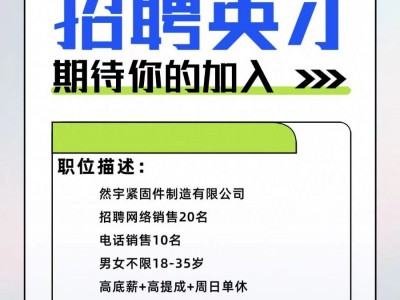 然宇紧固件制造有限公司 招聘网络销售20名电话销售10名 男女不限18-35岁 高底薪+高提成+周日单休 有专业的团队一对一的培训上班即可开单 上班时间9:00下班5.30 地址:中华大街永洋大酒店办公楼 电话: