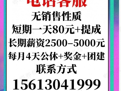 招聘电话客服:无销售性质,短期一天80元+提成,长期:薪资2500–5000元,每月4天公休+奖金+团建,联系方式:15613041999//13633206266微信同步