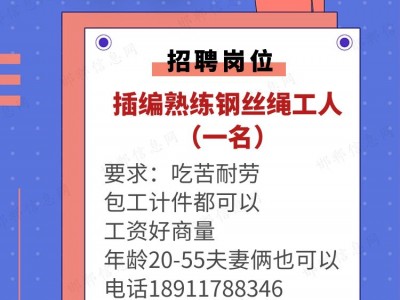 北京昌平门市招插编熟练钢丝绳工人一名,要求吃苦耐劳,包工计件都可以,工资好商量年龄20-55夫妻俩也可以电话18911788346