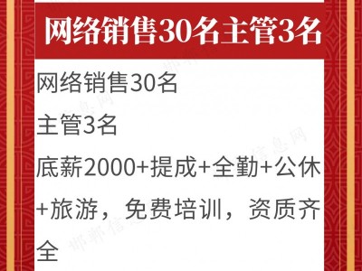 邯郸达硕紧固件招聘网络销售30名,主管3名,底薪2000+提成+全勤+公休+旅游,免费培训,资质齐全,