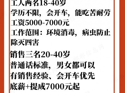 北京消毒消杀虫害防制公司(老板永年人)招聘工人两名(18-40岁) 5000-7000元,销售三名(20-40岁)底薪+提成7000元起,包吃包住,工作地点在房山区,电话(微信):13001224666苏先生