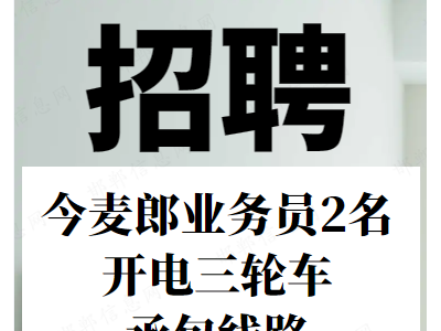 招聘今麦郎业务员2名,要求开电三轮车承包线路,销售今麦郎饮品,保底4500-8000元,上不封顶