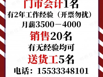 招聘:门市会计1名,有2年工作经验(开票勿扰)3500-4000,销售20名,有无经验均可。送货工5名,联系电话:15533348101.微信:ransheng8888888 地址:飞宇螺丝大世界40排B1