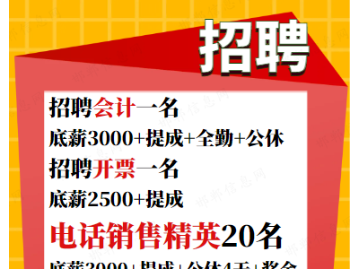 电话销售精英20名,底薪3000+提成+公休4天+奖金