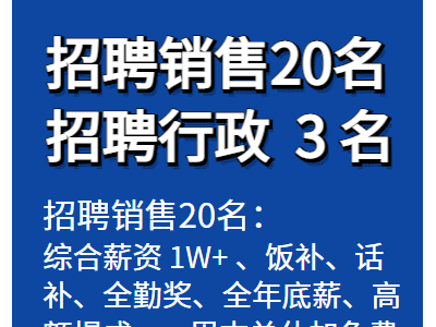 招聘销售20名:综合薪资 1W+ 、饭补、话补、全勤奖、全年底薪、高额提成、 周末单休加免费培训
