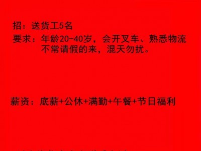 招工 送货工5名(20-40岁)会开叉车、熟悉物流,不常请假的来,混天勿扰13831037775