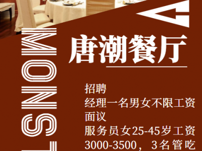 招聘,经理一名男女不限工资面议,服务员女25-45岁工资3000-3500,3名管吃住