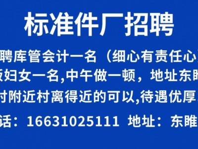 标准件厂招聘:诚聘库管会计一名(细心有责任心)。做饭妇女一名中午做一顿,地址东睢宁村附近村离得近的可以。待遇优厚。电话:16631025111。地址:东睢宁。