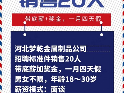 招聘标准件销售20人(18~30岁)带底薪加奖金,一月四天假,河北梦乾金属制品公司,河北铺产业城7号门,联系电话:153 5052 0988