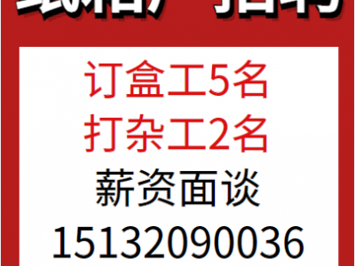 娄山附近纸箱厂招聘!订盒工5名,打杂工2名,薪资面谈,电话15132090036/13930095023