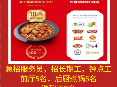 天骏美食街,宋小七石锅鸡米饭,急招服务员,招长期工,钟点工,前厅5名,后厨煮锅5名,洗碗工2名,工资2800--4500待遇:底薪+全勤奖+公休