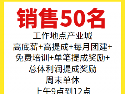 招聘销售50名,工作地点产业城,高底薪+高提成+每月团建+免费培训+单笔提成奖励+总体利润提成奖励,周末单休,上午9点到12点,下午两点到6点。有意者可电话拨打,面谈细节 姚先生