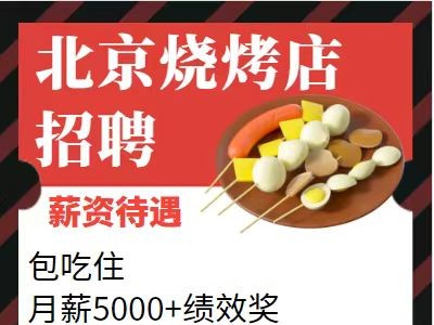 【北京烧烤店招聘】包吃住,月薪5000+绩效奖金500,月休2天