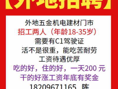 外地五金机电建材门市招工两人,需要有C1驾驶证年龄18-35岁,活不是很重,能吃苦耐劳,工资待遇优厚,吃的好,住的好,一天200 元干的好,涨工资年底有奖金18209671165 陈