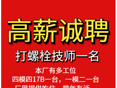 高薪诚聘打螺栓技师一名,本厂有多工位四模四17B一台,一模二一台,厂里提供吃住,常年有活。