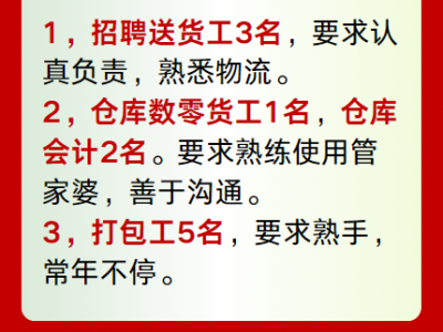 1,招聘送货工3名,要求认真负责,熟悉物流。