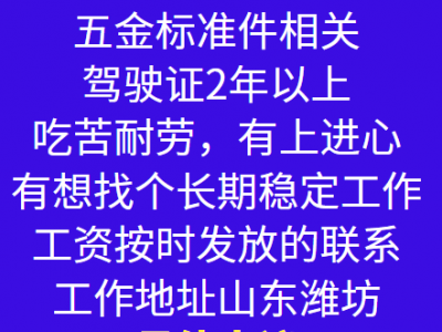 司机两名C1,五金标准件相关,驾驶证2年以上,要求,吃苦耐劳,有上进心。有想找个长期稳定工作,工资按时发放的联系。