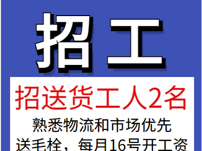 招送货工人2名,熟悉物流和市场优先,送毛栓,每月16号开工资,试用期有工资,不管饭,事少优先