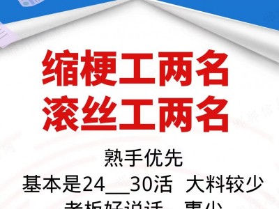 招缩梗,滚丝工两名,熟手优先,基本是24__30活,大料较少,老板好说话,事少,工资月结,能长期干的联系,厂址:睢宁附近