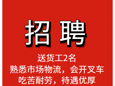 招工,送货工2名,熟悉市场物流,会开叉车,吃苦耐劳,待遇优厚,混天绕行。