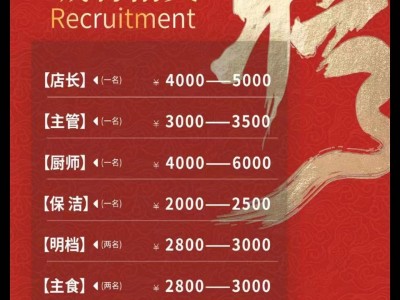 招聘主管:3000-3500 (1名),明档:2800-3000 (2名),主食:2800-3000(1名),帮厨:2800-3000(2名),饮品:2800-3000(1名),服务员:2800-3000(20名),洗碗工:2500-2800(3名),保洁阿姨:2000-2500(1名),地址:时代广场北门欧派楼上。工休三天,感兴趣的可以过来看看。
