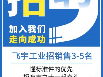 飞宇工业招销售3-5名,懂标准件的优先,招有志之士一起奋斗,自产自销有优势,招市场送货工人一名,要求熟悉物流