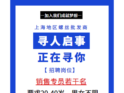 上海地区螺丝批发商,招销售专员,若干名,要求20-40岁,男女不限,会开车,成熟稳重,工资6000-1万多,有员工宿舍,有销售经验优先