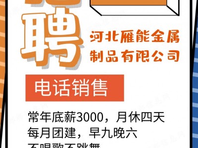 河北雁能金属制品有限公司招聘电话销售,常年底薪3000,月休四天,每月团建,早九晚六,不唱歌不跳舞,产业城,