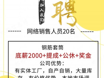 西苏路口三利工矿院内招聘网络销售人员20名,钢筋套筒, 底薪2000+提成+公休+奖金,实体工厂,有价格优势,本地市场调货,外地经销商,均可销售。安轩钢筋套筒生产厂家