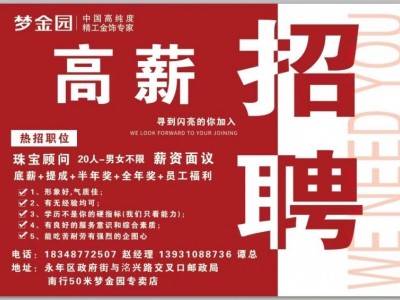 永年梦金园黄金珠宝店 珠宝销售10名高薪招聘店长2名主管3名 电话:赵经理,谭总 地址:永年区政府街与洺兴路交叉口邮政局南行50米梦金园专卖店