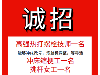 诚招,一,高强热打螺栓技师一名,能够冲床改号,滚丝机调整,等零活,二,冲床缩梗工一名,挑杆女工一名,数控车床女工一名,