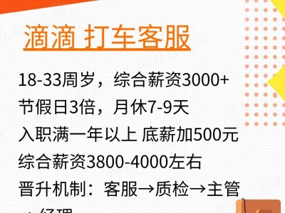 招聘 滴滴打车客服18-33周岁,综合薪资3000+,节假日3倍,月休7-9天,入职满一年以上,底薪加500元综合薪资3800-4000左右,晋升机制:客服→质检→主管→ 经理 (晋升后综合工资在4500-5500左右,不低于4500)