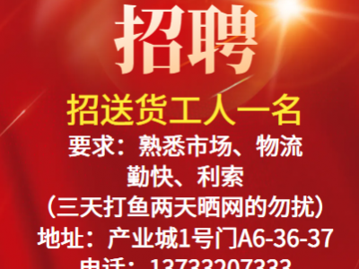 招送货工人一名,要求:熟悉市场、物流,勤快、利索(三天打鱼两天晒网的勿扰)