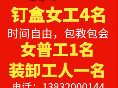 招工:龙泉纸箱厂招钉盒女工4名,时间自由,包教包会。女普工1名,装卸工人一名电话 15231061622(微信不聊,请电话联系)