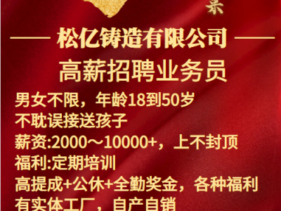 松亿铸造有限公司常年招聘:业务员,2000~10000+上不封顶,高提成+公休+全勤奖+各种福利,不耽误接送孩子,实体工厂,自产自销