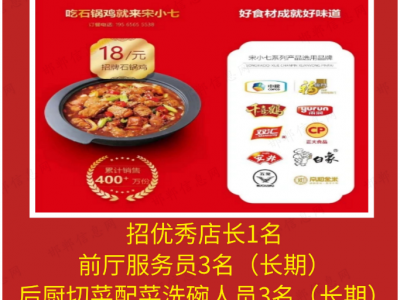 天骏美食街,宋小七石锅鸡米饭,招优秀店长1名,前厅服务员3名(长期),后厨切菜配菜洗碗人员3名(长期),工资3000--4000,另招钟点工数名。