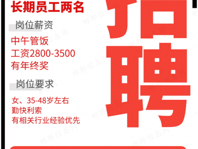 招聘:名关铁路西附近艾灸馆招聘长期员工两名;要求女、35-48岁左右,勤快利索 有相关行业经验优先;中午管饭,工资待遇2800-3500有年终奖。 非诚勿扰!!