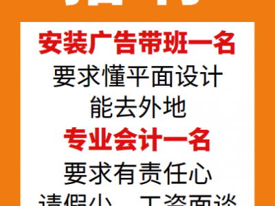 招聘,安装广告带班一名,要求懂平面设计,能去外地,专业会计一名,要求有责任心,请假少,工资面谈