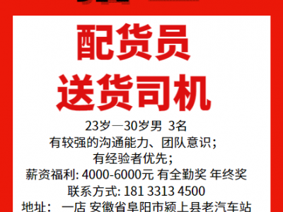 李正螺丝 诚聘:配货员、送货司机、薪资福利: 4000-6000元 有全勤奖 年终奖;